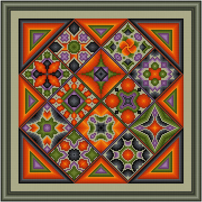 Diamond shaped sections are each enhanced with a different design. Shades of Halloween colors (orange, black. green and purple) are used. All whole stitches. Floss / colors may be changed.