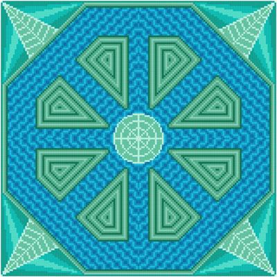 Image of the water flowing around with multiple ‘chutes’ to the center of the design remind one of the amusement ride. The appearance of the design looks more complicated than the actual stitching. Colors may be changed to preference of stitcher if desired. Whole stitches are used.