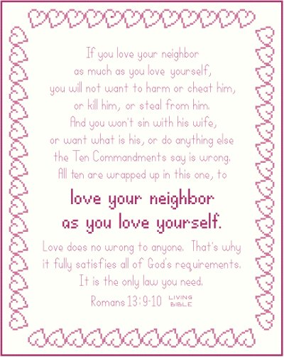 The words of the scripture, Romans 13: 9-10, are a reminder to love all others, near and far. This design is the often referred to scripture about loving your neighbor as yourself. The hearts creating the border enhance the words. Whole and back stitches (scripture) are used.